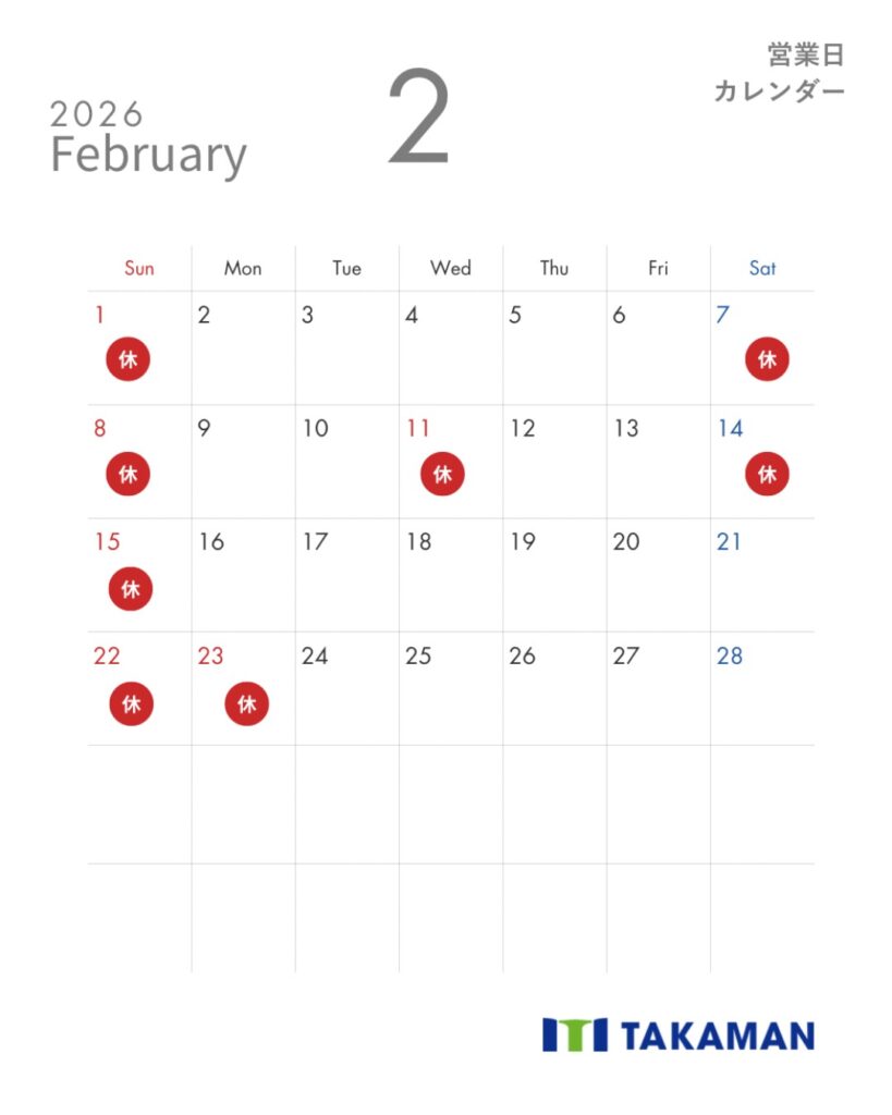 2026年 2月休業日のお知らせ 投稿日 2026-01-28 著者 takuaman-ice カテゴリー お知らせ 日頃より弊社をご愛顧いただきありがとうございます。弊社の2月の休業日につきましては下記をご覧ください。 祝日 11日(水)、23日(月)第1土曜日7日、第4土曜日14日毎週日曜日上記、2月の休業日となりますのでよろしくお願い致します。