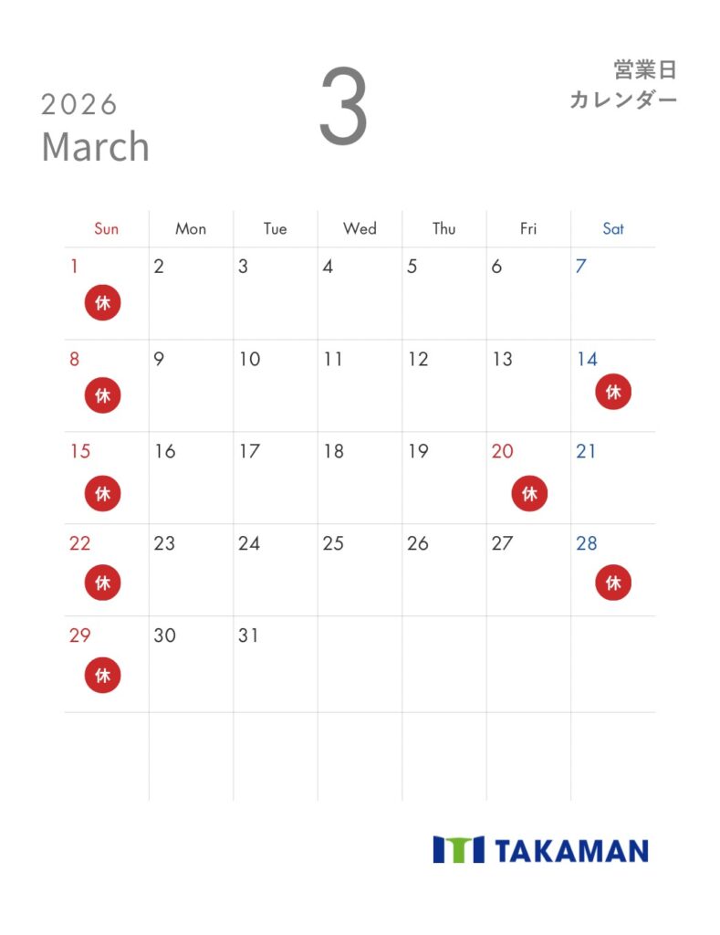 2026年 3月休業日のお知らせ 投稿日 2026-02-25 著者 takuaman-ice カテゴリー お知らせ 日頃より弊社をご愛顧いただきありがとうございます。もうすぐマンサクの花が咲き誇る3月を迎えます。弊社の3月の休業日につきましては下記をご覧ください。 祝日 20日(金)第2土曜日14日、第4土曜日28日毎週日曜日上記、3月の休業日となりますのでよろしくお願い致します。